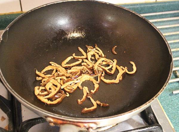 5.炒鍋加一匙油,小火爆香香菇,加入1小匙糖和1小匙醬油,使其入味。