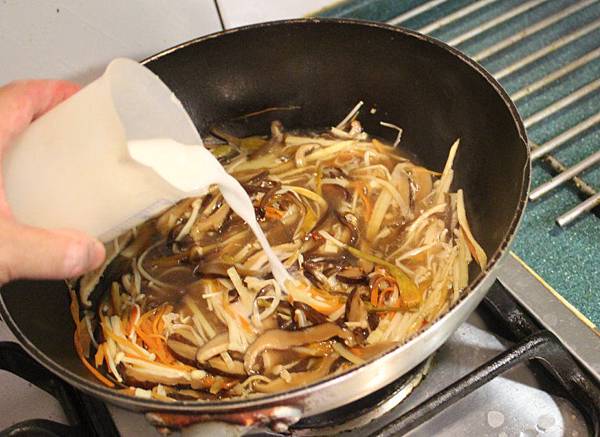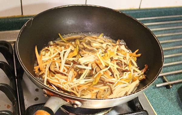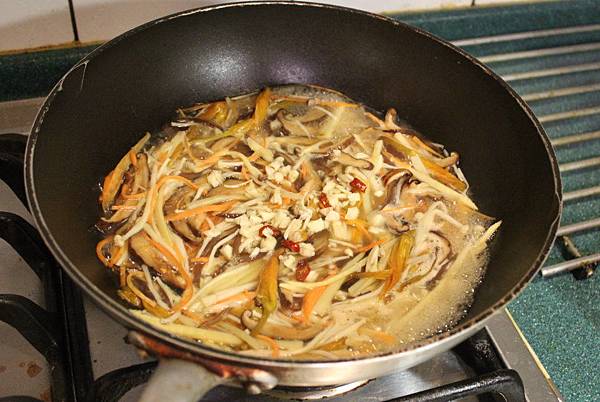 6.再放入黑木耳絲、紅蘿蔔絲、筍絲、金針和400CC的香菇水,煮10分鐘。