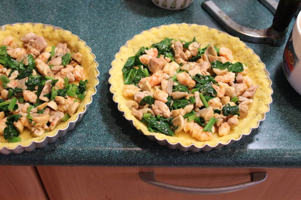 8.趁烤派皮空檔將雞腿肉炒半熟,加入鮮蝦、蘑菇,以鹽和胡椒調味後,加入菠菜拌炒一下即可。