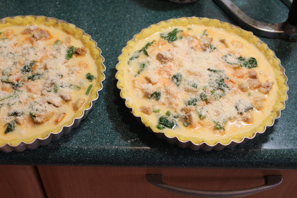 10.倒入牛奶和蛋打勻的蛋汁,灑上帕瑪森起士粉。