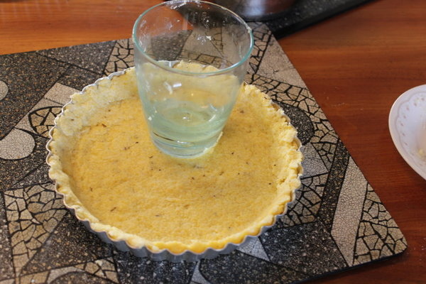 6.等玉米糊稍涼,將玉米糊放入派盤,用手塑成派型,可用平底杯子將派底壓平。