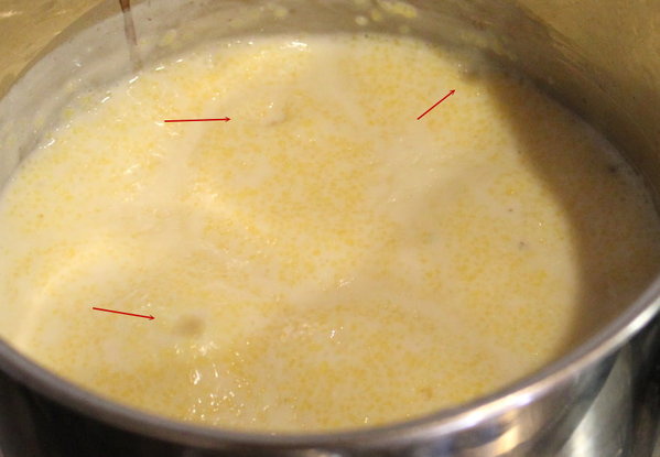 3.玉米粉煮一陣子很快就開始變糊,偶而拌一下以免燒焦。玉米糊煮熱後會如泥火山一樣噴漿,小心不要被燙到。