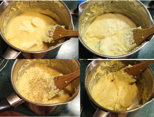 2.將雞高湯和牛奶倒入深鍋,煮滾後轉小火,慢慢倒入義大利玉米粉,邊倒邊拌。玉米粉與液體的體積比是1:5。