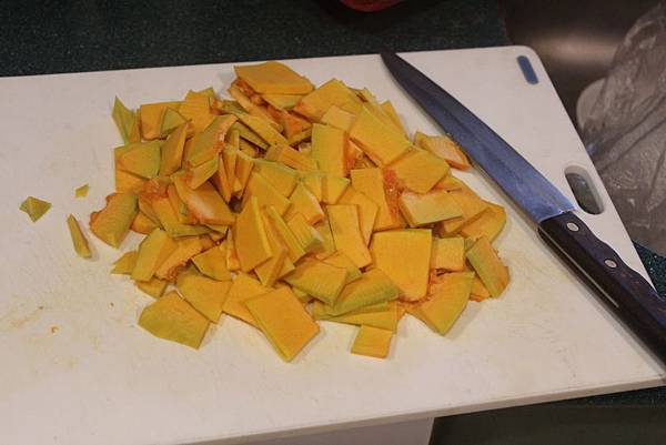 1.南瓜去皮去籽切薄片。洋蔥切碎。
