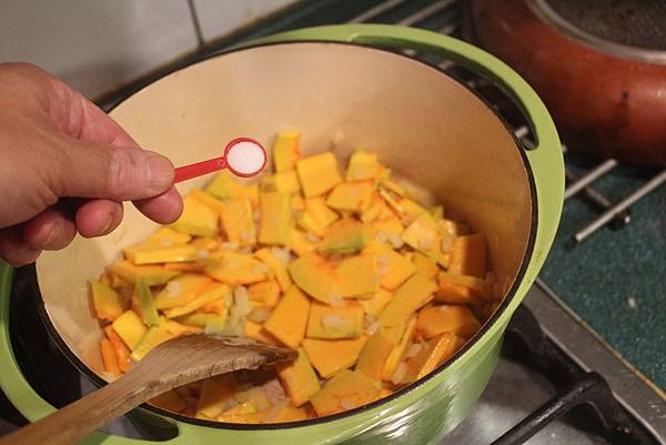 4.放入南瓜片,拌炒至南瓜片都沾上奶油油脂後,灑入0.25小匙的鹽後繼續拌炒。