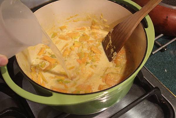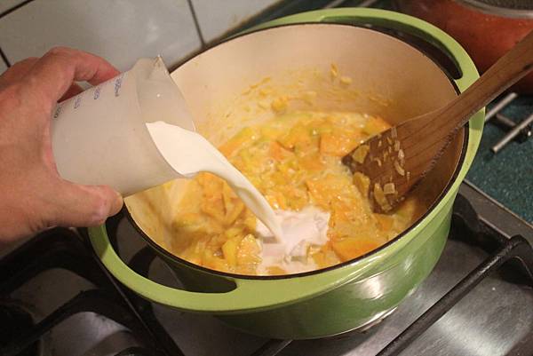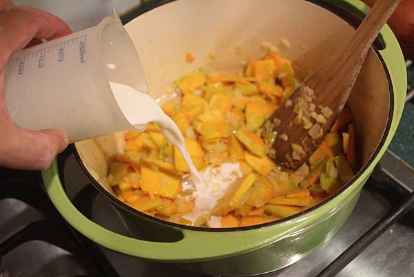 5.炒約5分鐘,將南瓜片炒軟後,倒入100cc的牛奶。