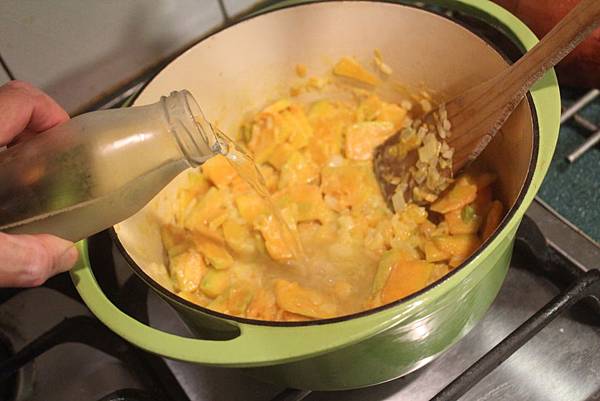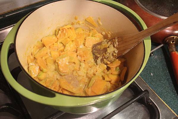 6.再繼續炒到牛奶融入南瓜片收汁。