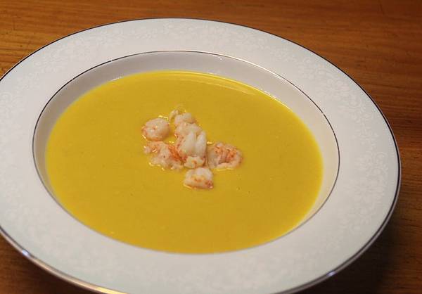 13.盛盤,擺上炒過奶油的龍蝦肉。南瓜湯很甜、奶香濃郁帶些龍蝦鮮味,很好喝。跟炒過奶油的龍蝦肉更是相得益彰。