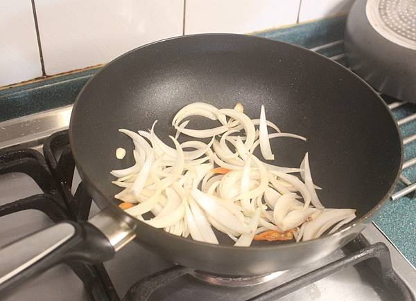 4.同一鍋用剩下的油脂報香蒜片和辣椒。