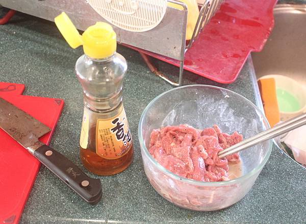1.牛肉逆紋切薄片,以酒、醬油、鹽、胡椒抓醃約10分鐘,放入太白粉拌勻。