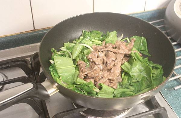 6.放入菠菜炒一下,菠菜很快就熟,放回牛肉一起拌炒。